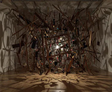 Based in London, Parker is renowned for her large-scale installations which push the boundaries of what art can be and how it might function in and impact on the world. She often uses found or discarded materials, which are variously squashed, exploded, shot, burnt, broken, suspended, inhaled, exhaled, chewed, spat, stained or cast from cliffs—subjected to often violent processes of transformation through which they become something other or opposite.